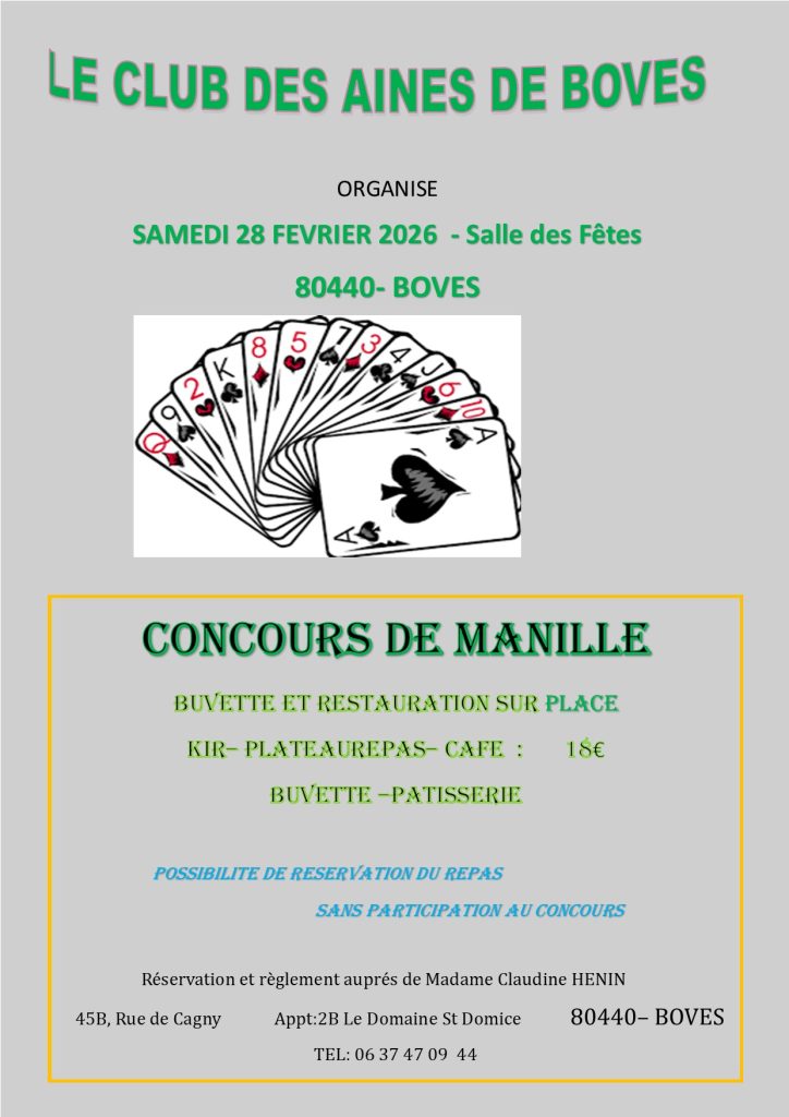 Le Club des Aînés de Boves organise un concours de manille le samedi 28 février 2026 à la Salle des Fêtes de Boves.